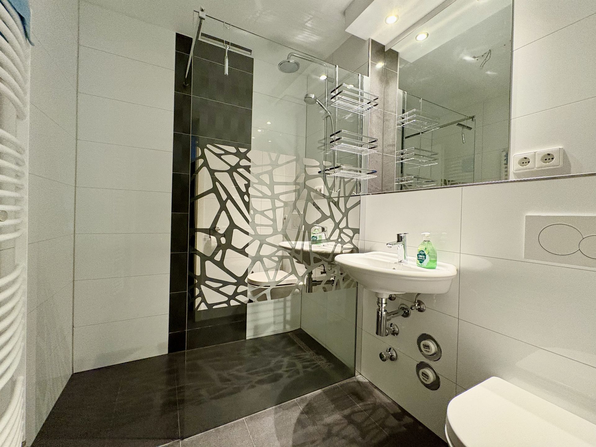 - deckenhoch gefliestes Badezimmer mit begehbarer Dusche, Waschbecken, WC und Handtuchheizkörper